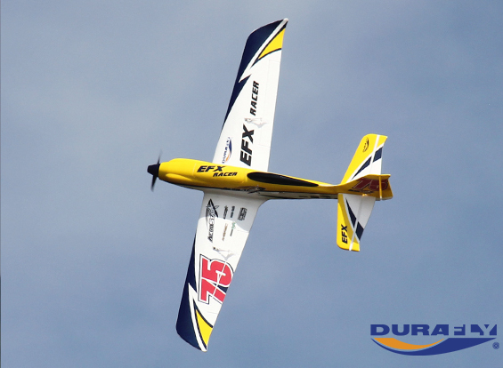 The Durafly EFX Racer has been designed from the ground up to offer the speed (100mph+) and strength normally reserved only for high end full composite models, but with the handling and satisfaction only a Durafly model can offer. This 1100mm (43") span model boasts a huge list of high performance features that set the EFX apart from the competition. The 2300kv 28mm brushless outrunner (designed specially for the EFX) uses ultra high speed Japanese bearings for only the best performance. The pre-installed Durafly 50amp ESC has been optimized to deliver smoothly the power you need, when you want it and all control surfaces use high speed, high torque digital 9g servos (metal geared on the ailerons) together with ball link connectors to deliver true precision and control through-out the speed range. The EFX Racers high performance doesnt end with the electronics. The airframe has been engineered to be both rigid and lightweight, utilizing both glass and carbon fiber reinforcements throughout the model in combination with Super Compressed EPO foam and a highly polished surface finish to deliver the ultimate in performance in the air and the sleekest of looks on the ground. Following the supplied comprehensive manual, the EFX clips and screws together in minutes. Connect the control surfaces to the servos and install your own choice of receiver & lipoly pack and you are ready to fly! Versatility is another of the design features of the EFX Racer. Right out of the box youre provided with two different power options, 6x5 for 3cell and 5x5 for 4cell. For good all round sports performance a 2200mah 3S lipo on the 6x5 will give good speed and is recommended for pilots less experienced with fast models. However, for true high speeds and power when you open the throttle, a 1800mah 4S on the 5x5 is the winners choice and will get you going over 100mph. For the ultimate speed/performance on 4cell, a 5.5x4.5 is recommended for 100mph+. Complimenting the amazing speeds of the EFX is it stunning agility in the air. A simple under arm hand launch at 3/4 throttle from standing gets the EFX in the air and youll have unlimited vertical as soon as you open up to full (4S). A full house of controls (Aileron, Elevator, Rudder) gives the EFX remarkable aerobatics performance. Loops can be as BIG as you want them, rolls are very precise either fast or slow and the EFX will knife edge all day long! Thanks to the exceptionally strong airframe, high powered, high G maneuvers will not present a problem either. The EFX Racer never fail you, but always leave you wanting more! Its not all about going fast and turning hard, youll find the EFX handles exceptionally at slows speeds with both elegance and confidence inspiring grace. This is especially true in landing where youll find no hint of a stall and good control all the way down to the ground. Whatever set-up you choose and however you prefer to fly, your EFX Racer will perform and deliver time and time again and always keeping you coming back for more.